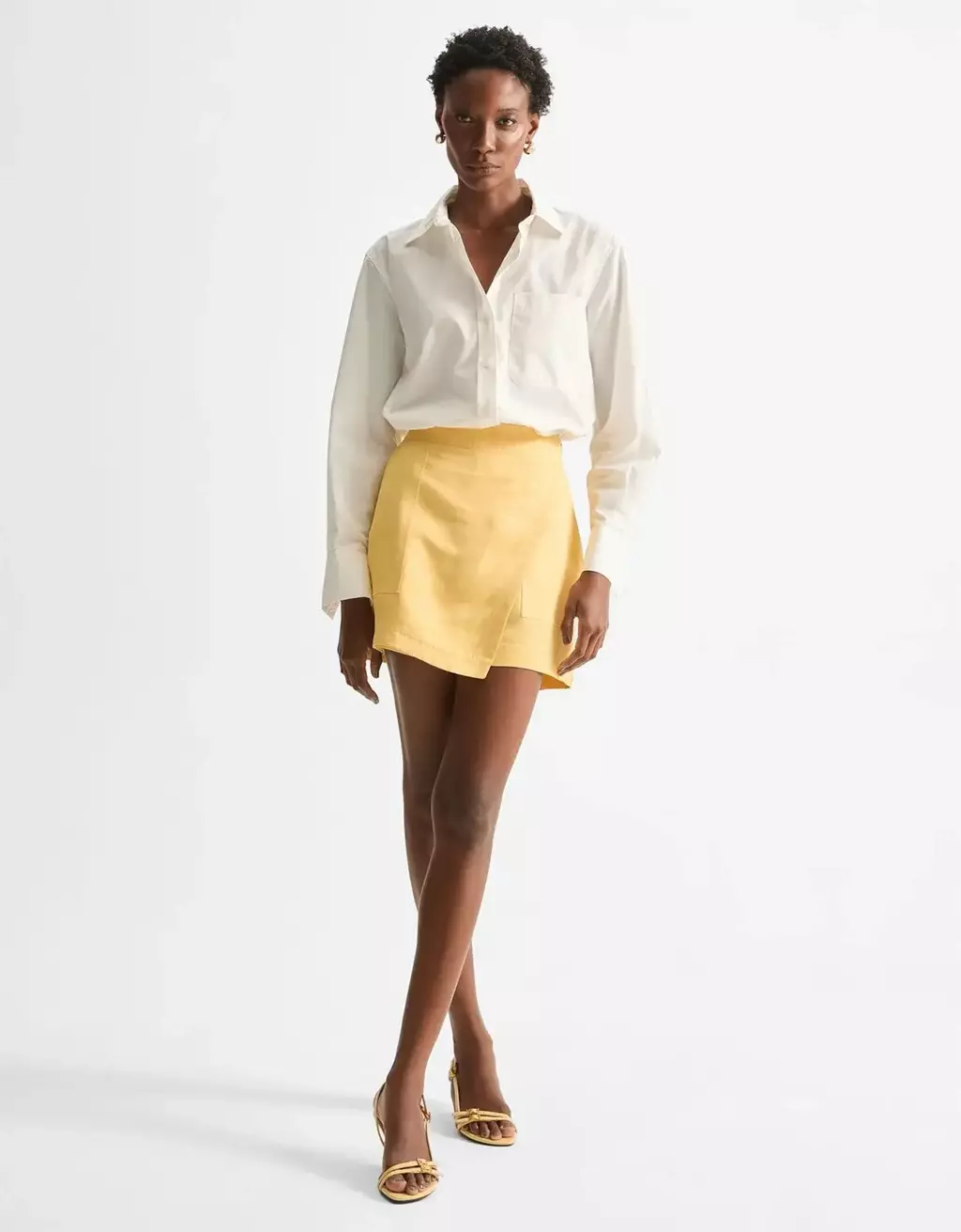 Confeccionado com tecido de alta qualidade, este short-saia oferece conforto e liberdade de movimento, ideal para os dias quentes e para compor looks versáteis. Seu tom amarelo vibrante traz um toque de alegria e frescor ao seu guarda-roupa, enquanto os bolsos funcionais garantem praticidade sem abrir mão do estilo.