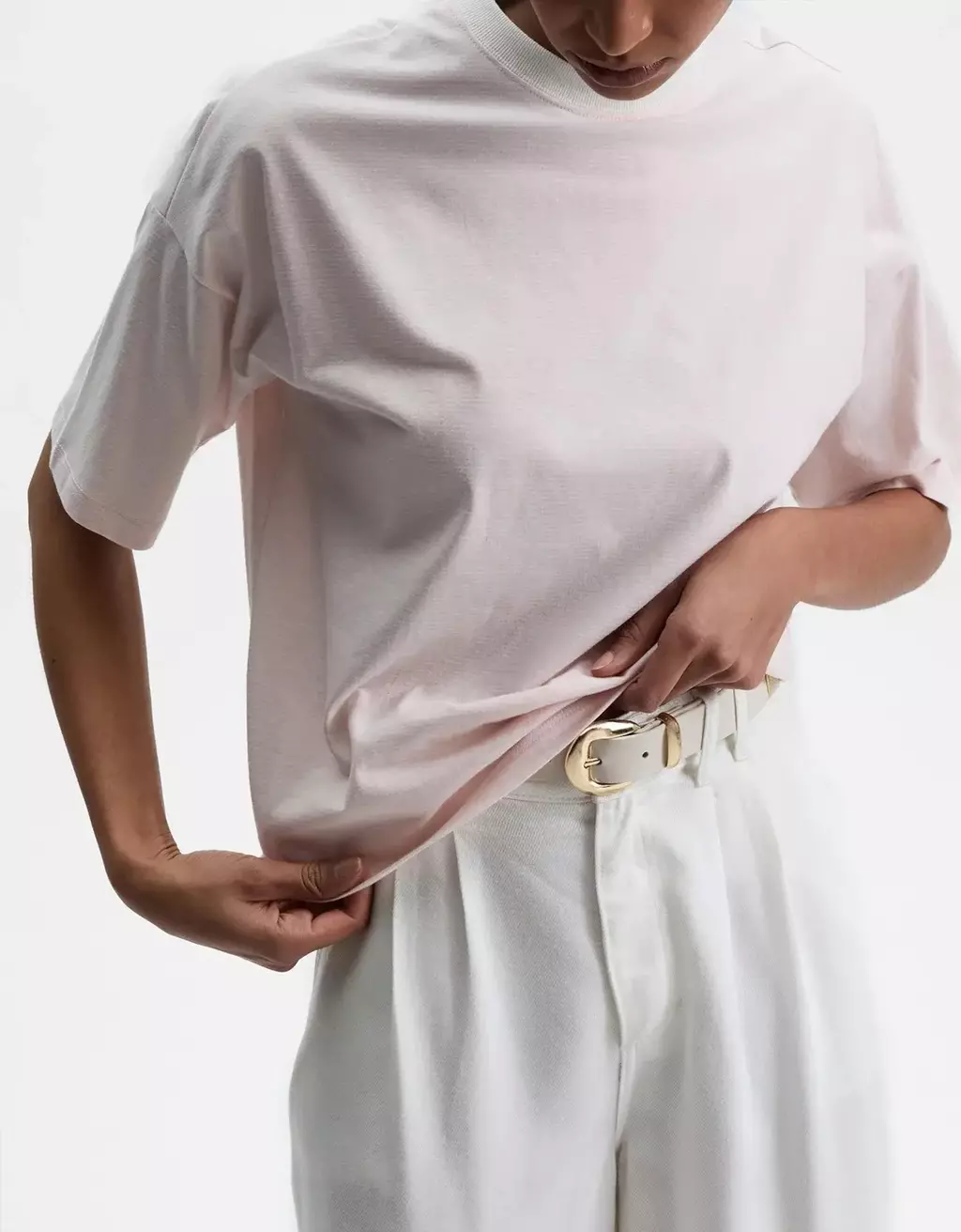 Confeccionada com tecido de alta qualidade, a camiseta oferece um caimento impecável que se adapta ao corpo com suavidade, garantindo conforto durante todo o uso. As listras finas em tom rosa adicionam um toque sutil de cor e elegância, facilitando combinações com calças, saias ou shorts para diversas ocasiões.